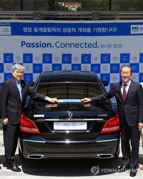 | △ 평창동계올림픽 홍보, 차량스티커 부착 (서울=연합뉴스) 홍해인 기자 = 21일 오전 서울 여의도 전경련회관 앞에서 열린 '평창 G-1000 평창동계올림픽 성공개최 기원 차량스티커 부착행사'에서 조양호 평창동계올림픽 조직위원장(왼쪽)과 허창수 전국경제인연합회 회장이 허 회장의 차량에 대회 슬로건인 'Passion. Connected. 하나된 열정!'이 새겨진 스티커를 부착하고 있다. 2015.5.21 hihong@yna.co.kr |