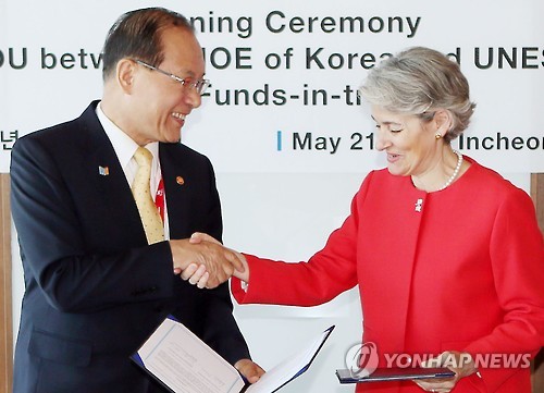 | △ 한국-유네스코 신탁기금 사업 업무협약 체결 (인천=연합뉴스) 윤태현 기자 = 황우여 사회부총리 겸 교육부 장관과 이리나 보코바 유네스코 사무총장이 21일 오전 인천시 연수구 오크우드 호텔에서 열린 '아프리카 ICT 활용 교육혁신을 위한 한국-유네스코 신탁기금 사업 업무협약 체결식'에서 협약서에 서명한 뒤 악수하고 있다. 2015.5.21 tomatoyoon@yna.co.kr |