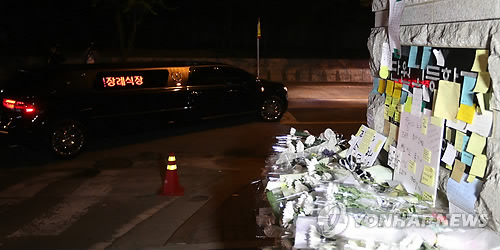 | △ <여객선침몰> 단원고 교감 발인 (안산=연합뉴스) 특별취재팀 = 지난해 4월21일 새벽 침몰 여객선 세월호에서는 구조됐지만 결국 숨진 채 발견된 안산 단원고 교감의 장례식이 열려 운구차량이 경기도 안산 단원고 운동장을 돈 뒤 학교를 나서고 있다. 2014.4.21 drops@yna.co.kr http://blog.yonhapnews.co.kr/geenang |