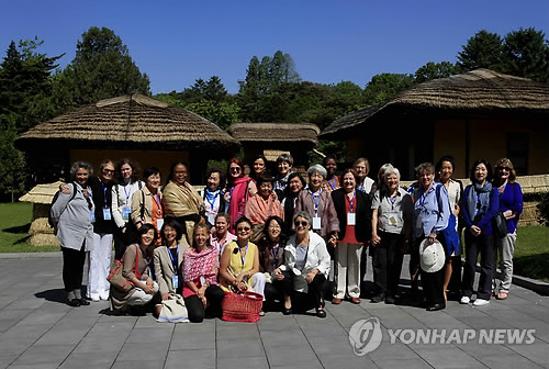 | △ 만경대서 포즈 취한 세계 여성 운동가들 (평양 AP=연합뉴스) 미국의 세계적 여성운동가 글로리아 스타이넘(왼쪽 두번째)과 2011년 노벨평화상 수상자 라이베리아의 레이마 보위(왼쪽 다섯번째), 1976년 노벨평화상 수상자 북아일랜드의 메어리드 매과이어(오른쪽 일곱번째·붉은셔츠에 검은재킷) 등 세계 여성 평화 운동가들이 20일 김일석 주석 생가가 있는 평양 만경대를 방문해 기념사진을 찍고 있다. 이들은 오는 24일 비무장지대(DMZ)를 걸어서 북한에서 남한으로 넘어오는 '위민크로스DMZ'(WCD) 행사를 벌일 예정이다. marshal@yna.co.kr Peace activist Gloria Steinem, second left, Nobel Peace Prize laureates, Leymah Gbowe, fifth left, and Mairead Maguire, seventh right in a red shirt and dark jacket, and other peace activists pose for a group photo during their visit to Mangyongdae, the birthplace of North Korea's late leader Kim Il Sung, in Pyongyang, Wednesday, May 20, 2015. A group of female peace activists arrived in North Korea's capital on Tuesday for a march across the Demilitarized Zone that they hope will bring world attention to calls for a resolution to tensions on the Korean Peninsula, scheduled on Sunday, May 24. (AP Photo/Kim Kwang Hyon) |