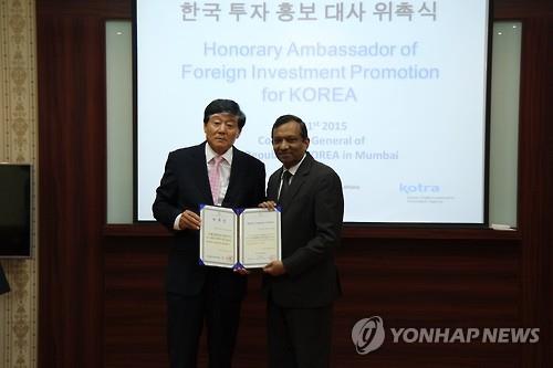 | △ 21일(현지시간) 인도 뭄바이 한국 총영사관에서 장석구 총영사(왼쪽)가 파완 쿠마 고엔카 인도 마힌드라 그룹 자동차·농기계 부문 사장에게 한국투자 홍보대사 위촉장을 전달하고 있다.<< 코트라 뭄바이 무역관 제공 >> |