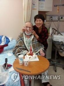 | △ (밴쿠버=연합뉴스) 조재용 통신원 = 제르드 트루벤바크씨(71)가 암 수술을 한 한국 경북대학병원 병실에서 부인 나오미 김씨의 간호를 받고 있다. 2015.5.22 <<CBC 홈페이지 화면 캡처>> jaeycho@yna.co.kr |
