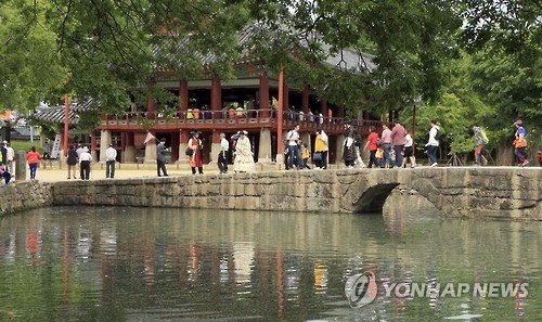 | △ '춘향제 열기 속으로!' (남원=연합뉴스) 백도인 기자 = 제85회 춘향제가 개막한 22일 행사장인 남원 광한루원 앞의 오작교를 관광객들이 한가롭게 거닐고 있다. 25일까지 이어지는 올해 춘향제에서는 다양한 국악 공연과 함께 20여가지의 놀이와 체험, 문화 행사가 진행된다. 2015.5.22 doin100@yna.co.kr |