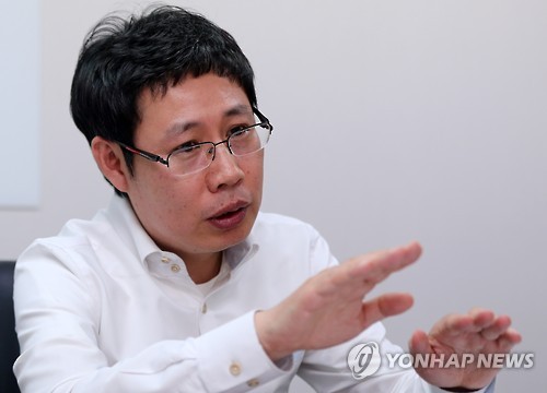 | △ ㈜아이디소프트 곽진영 대표 (대구=연합뉴스) 김준범 기자 = ㈜아이디포소프트 곽진영 대표가 21일 오후 대구 중구 자신의 사무실에서 연합뉴스와 인터뷰하고 있다. 곽 대표는 개인들이 각자의 서버를 활용해 영화 등 데이터를 무제한으로 주고받을 수 있는 신개념 모바일 메신저 '깡통'을 개발해 해외 진출을 앞두고 있다. 2015.5.22 psykims@yna.co.kr |
