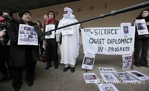 | △ 우즈베키스탄 인권단체들이 2011년 1월 벨기에 유럽연합(EU) 집행위원회 앞에서 이슬람 카리모프 우즈베키스탄 대통령의 인권탄압을 규탄하는 시위 모습 (연합뉴스 DB). |