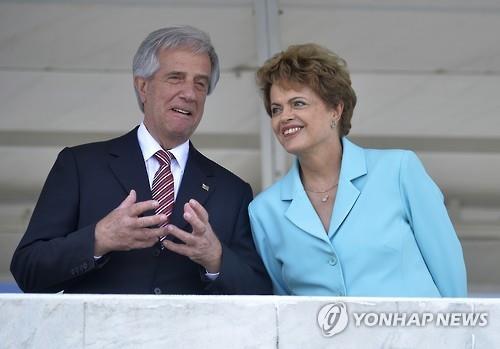 | △ 지우마 호세프 브라질 대통령(오른쪽)과 타바레 바스케스 우루과이 대통령이 21일(현지시간) 브라질리아에서 정상회담을 했다.(AP=연합뉴스) |