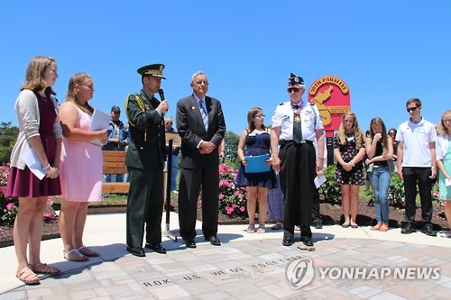 | △ 美중학생들이 손수 가꾼 '38선 정원'…"한국과의 끈 느껴져요" (밀포드<미 버지니아주>=연합뉴스) 노효동 특파원 = 22일(현지시간) 낮 미국 버지니아주 밀포드 카운티의 캐럴라인 중학교에서 이 학교 역사동아리 소속 학생들과 한국전 참전용사들, 주미대사관 무관단 등 모두 100여명이 참석한 가운데 38선 기념정원 벽돌기증식이 열렸다. 주미대사관 무관단이 기증한 벽돌에는 한·미동맹의 강건함을 상징하는 문구인 'R.O.K-U.S We Go Together'(같이 갑시다)가 쓰여져있다. 이날 기증식에는 주미대사관 신경수 국방무관과 장진호 전투의 주역인 스티븐 옴스테드 예비역 중장, 존 토머스 리치먼드 한국전쟁 참전용사회 회장이 참석했다. |