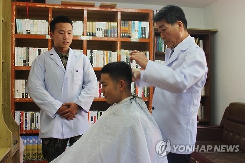 | △ 장병 이발 무료봉사 나선 '사랑의 가위손' (서울=연합뉴스) 전남 화순군 능주면에서 이발관을 운영하는 홍문표(61.오른쪽) 씨가 15년째 육군 제31보병사단 예하 화순대대를 매주 방문, 장병을 위해 '사랑의 가위질'을 하고 있다. 2015.5.25 << 육군 제공 >> photo@yna.co.kr |