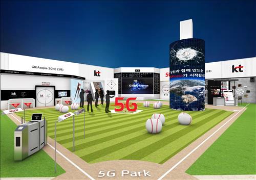 KT는 관람객이 5세대(5G) 통신 기술을 한눈에 확인할 수 있도록 전시를 준비했다. 특별히 KT위즈가 프로야구 1군 리그에 진입한 첫해를 기념해 야구장 콘셉트로 부스를 꾸민다.