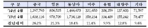 중국노선 점유율은 2011년 4월 9.9%에서 작년 4월 29.5%로 매년 늘었고 올해 4월 30%를 넘어섰다.
