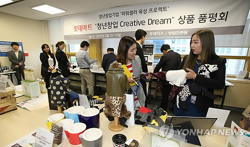 | △ 지난 12일 오후 서울 송파구 신천동 롯데마트 본사에서 열린 '청년창업 크리에이티브 드림 프로젝트' 품평회에서 롯데마트 머천다이저(MD)들이 청년창업 기업 관계자로부터 상품에 대한 설명을 듣고 있다. |