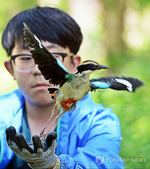 | △ (제주=연합뉴스) 전지혜 기자 = 25일 오후 제주 절물자연휴양림 인근 숲에서 제주야생동물구조센터 학생 자원봉사자가 천연기념물(제204호)이자 멸종위기종인 팔색조를 자연으로 돌려보내고 있다. 이 팔색조는 지난 15일 제주시 노연로의 한 건물 유리창에 부딪쳐 추락하는 사고로 얼굴과 다리 등을 다쳤으나 구조센터에서 치료를 받으며 회복해 이날 자연으로 돌아갔다. 2015.5.25 atoz@yna.co.kr |