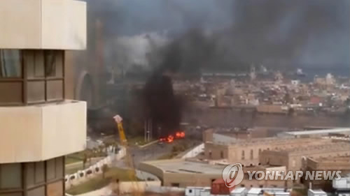 | △ IS 추정 괴한 트리폴리 호텔 습격 (AP=연합뉴스) 27일(현지시간) 오전 리비아 수도 트리폴리의 지중해안 5성급 코린시아 호텔이 무장 괴한들에게 공격받은 가운데 호텔 밖에서 연기와 불길이 치솟고 있다. 한 리비아 블로거가 인터넷에 올린 영상에서 캡처한 사진으로, 수니파 원리주의 무장단체 이슬람국가(IS)로 추정되는 괴한들의 차량폭탄 공격을 수반한 이날 습격으로 미국인, 프랑스인 각 1명 등 외국인 5명과 경비원을 포함 10명이 숨진 것으로 전해졌다. bulls@yna.co.kr (AP Photo/ @AliTweel via AP video) |