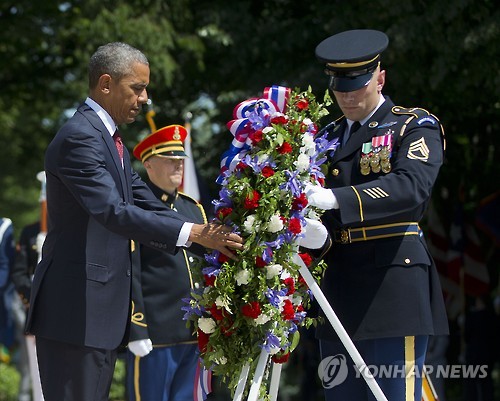 (워싱턴·서울=연합뉴스) 김세진 특파원 강건택 기자 = 버락 오바마 미국 대통령은 25일(현지시간) 우리나라의 현충일에 해당하는 '메모리얼 데이'를 맞아 워싱턴D.C. 근교에 있는 버지니아 주 알링턴 국립묘지를 찾아 무명용사 묘역에 헌화했다.