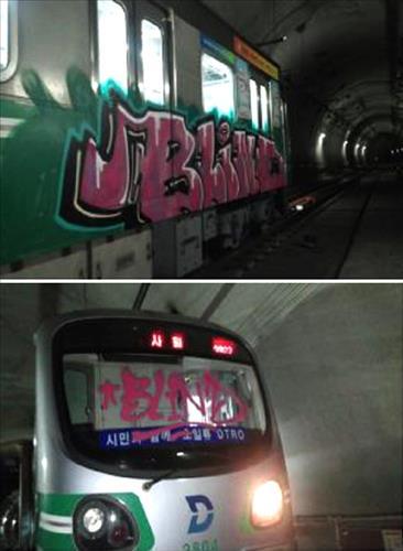 (대구·인천=연합뉴스) 김선형 윤태현 기자 = 이달 초 대구와 인천 지하철 전동차에 '대형 낙서(그라피티·graffiti)'를 그린 외국인들이 서울 강남일대 지하철에도 같은 낙서를 한 것으로 드러났다.