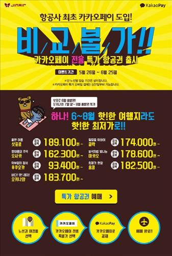 진에어는 카카오페이 도입 이벤트로 이날부터 6월 25일까지 카카오페이로만 구입할 수 있는 국제선 항공권 특가 프로모션을 진행한다.
