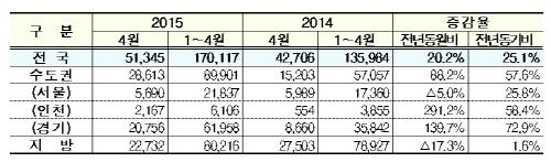 서울은 7천634가구로 12.1% 감소, 경기 7천348가구로 21.8% 감소, 인천은 831가구로 47.9% 늘어나 수도권 전체로는 작년 4월보다 15.2% 줄었다.