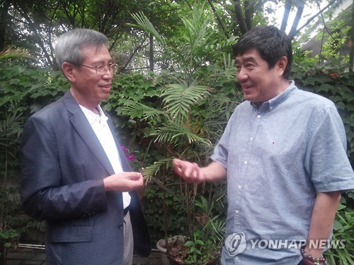 | △ 한중 작가회의서 만난 양국 중견 시인 이시영-량핑 (청두=연합뉴스) 한혜원 기자 = 한국과 중국의 중견 시인 이시영(66·왼쪽)과 량핑(梁平·60)이 중국 쓰촨(四川)성 청두(成都)시 바진문학원에서 만나 대담하고 있다. 두 사람은 25~26일 개최된 제9차 한중 작가회의에 참석해 서로 작품을 낭독했다. |