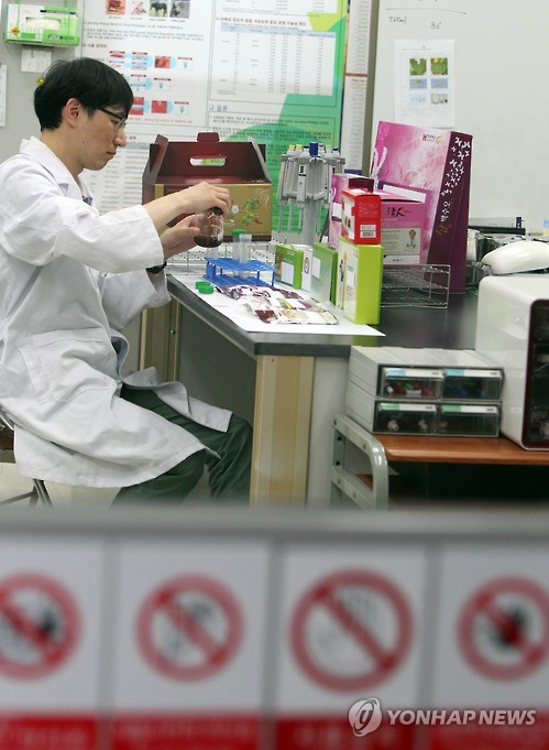 | △ 백수오 제품 유전자 검출 실험 (청주=연합뉴스) 김형우 기자 = 26일 오후 청주시 오송읍 식품의약품안전처에서 시중에 유통되는 백수오 제품 207개를 대상으로 이엽우피소 함유여부를 조사하기 위한 유전자 검출 실험을 진행하고 있다. 식약처 조사결과 시중에 유통되는 백수오 제품 가운데 이엽우피소가 검출되지 않은 '진짜' 백수오 제품은 5%에 불과한 것으로 나타났다. |