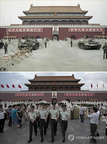 | △ 1989년 톈안문 광장에 인민해방군 탱크부대가 진주한 모습(위)과 25주년이었던 지난해 공안 행진 모습(아래) (AP=연합뉴스) |
