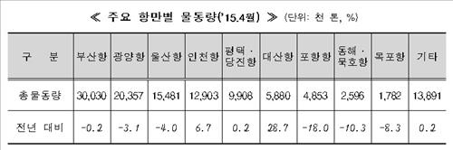 (세종=연합뉴스) 성혜미 기자 = 4월 전국 무역항에서 처리한 항만물동량은 총 1억1천768만t으로 작년 같은 기간보다 0.6% 감소했다.