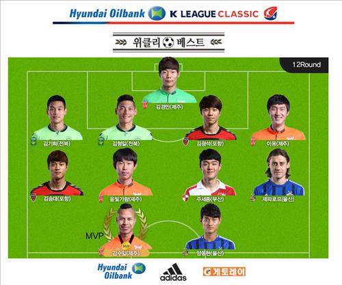 또 미드필드 부문에는 제파로프(울산), 주세종(부산), 윤빛가람(제주), 김승대(포항)가 선정된 가운데 수비수 부문에는 이용(제주), 김광석(포항), 김형일, 김기희(이상 전북)가 뽑혔다. 최우수 골키퍼는 김경민(제주)에게 돌아갔다.