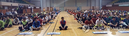 | △ 외로운 익산시 공무원노조위원장 (전주=연합뉴스) 김동철 기자 = 27일 전북 전주 화산체육관에서 열린 '제7회 전북도 공무원 노사 한마음 체육대회'에 익산시 대표로 김상수(55·가운데) 익산시 공무원노조위원장 1명만이 참여했다. 익산시는 행정 공백을 이유로 시 공무원들의 대회 참여를 허락하지 않았다. 2015.5.27 sollenso@yna.co.kr |
