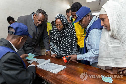 | △ 에티오피아 총선 돌입 (아디스아바바 AP=연합뉴스) 에티오피아가 총선거에 들어간 지난 24일(현지시간) 수도 아디스아바바 투표소에서 선관위 직원이 유권자들의 신분증을 확인하고 있다. |