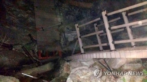 | △ 화천서 훈련 중 나무다리 끊어져 장병 21명 부상 (화천=연합뉴스) 이재현 기자 = 28일 오전 1시 30분께 강원 화천군 사내면 용담리 인근 생태탐방로 둘레길에서 육군 모 부대 소속 장병 21명이 야간 전술 훈련 중에 나무다리가 끊어지면서 3m 아래로 추락, 장병 21명이 다쳤다. 사진은 나무다리가 끊어진 현장 모습. 2015.5.28 jlee@yna.co.kr |