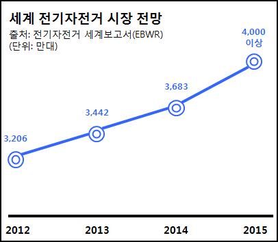 28일 삼성SDI[006400]의 e뉴스레터에 따르면 전기자전거 세계보고서(EBWR)는 세계시장 규모가 2012년 3천206만대에서 2013년 3천442만대, 2014년 3천683만대에 이어 올해 4천만대를 넘어설 것으로 추정했다. 3년 새 25%의 성장세를 보인다.