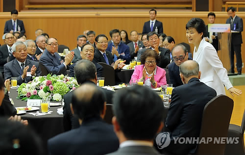 | △ 박근혜 대통령은 지난 14일 청와대 연무관에서 열린 이북도민 대표단과의 대화에서 북한 인권문제를 직설적으로 비판했다. 2015.5.14 |