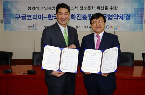 (서울=연합뉴스) 양정우 기자 = 한국정보화진흥원(NIA)과 구글코리아는 28일 정보화진흥원 무교청사에서 '창의적 IT 인재양성과 창조적 정보문화 환경조성'을 위한 업무협약(MOU)을 체결했다.