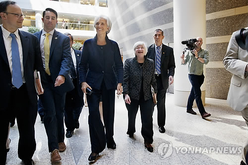| △ 라가르드·옐런, 금융권 과도 보상에 '일침' (워싱턴 AP=연합뉴스) 세계 경제의 두 여성 지도자인 크리스틴 라가르드 국제통화기금(IMF) 총재와 재닛 옐런 미국 연방준비제도(연준) 의장이 6일(현지시간) 미국 워싱턴DC IMF 본부에서 열린 '금융과 사회' 토론회에서 금융위기 이후에도 여전한 금융권의 과도한 보상체계를 개선하라고 한 목소리로 주문했다. 사진은 라가르드(가운데)와 옐런(라가르드 오른쪽)이 이날 토론회를 끝내고 회의장 밖으로 나가고 있는 모습. marshal@yna.co.kr International Monetary Fund (IMF) Managing Director Christine Lagarde, center, and Federal Reserve Chair Janet Yellen, laugh as they walk together after speaking at the Institute for New Economic Thinking Conference on Finance and Society, Wednesday, May 6, 2015, at the IMF in Washington. (AP Photo/Jacquelyn Martin) |