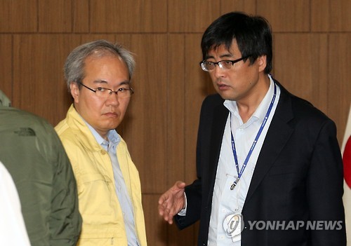 | △ 보건복지부, 중앙 메르스 관리 대책본부 마련 (세종=연합뉴스) 배재만 기자 = 권준욱 보건복지부 공공보건정책관(왼쪽)이 29일 오전 정부세종청사 보건복지부 중앙 메르스 관리 대책본부에서 열린 메르스 일일상황점검회의에서 김영택 질병관리본부 감염병관리과장과 대책을 논의하고 있다. |