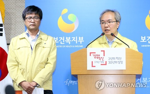 | △ 보건복지부, '메르스 추가 환자 2명 발생' (세종=연합뉴스) 배재만 기자 = 권준욱 보건복지부 공공보건정책관이 29일 오전 정부세종청사 보건복지부 공용브리핑룸에서 메르스 일일상황점검회의 결과를 브리핑하며 금일 오전 7시 현재 2명의 신규 환자를 확인했다고 밝히고 있다. 현재까지 총 환자 수는 9명이다. 왼쪽은 김영택 질병관리본부 감염병관리과장. 2015.5.29 scoop@yna.co.kr http://blog.yonhapnews.co.kr/f6464 |