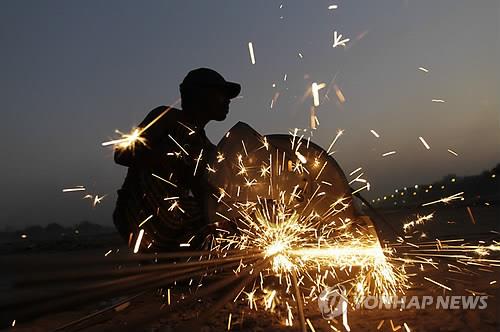 | △ 2월 23일 인도 아마다바드에서 한 노동자가 철근을 자르고 있다.(AP=연합뉴스) |
