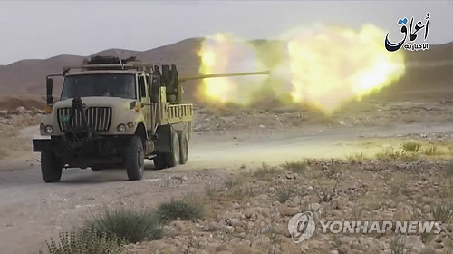 | △ 시리아 정부군-IS, 팔미라 유전지대서 격전 (팔미라 AP=연합뉴스) 수니파 극단주의 무장세력 '이슬람국가'(IS)의 무장 트럭이 시리아 팔미라 인근 유전지대에서 포를 쏘고 있다. 사진은 26일(현지시간) 한 민병대가 유튜브에 올린 동영상에서 캡처한 것으로 IS와 시리아 정부군 간의 전투 장면으로 보인다. 시리아 정부군은 지난 20일 IS에 빼앗긴 팔미라를 되찾기 위해 IS와 교전을 벌이고 있는 것으로 알려졌다. marshal@yna.co.kr This image made from a militant video posted on YouTube on Tuesday, May 26, 2015, which has been verified and is consistent with other AP reporting, purports to show an armored vehicle of the Islamic State group firing ammunition in Jezel oil fields near Palmyra, Syria. The militant video purportedly showed Islamic State group fighters battling Syrian government forces around the Jezel oil field near Palymra. (Militant video via AP) |