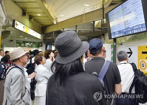 | △ (도쿄 교도=연합뉴스) 30일 오후 일본 오가사와라(小笠原) 제도 인근에서 발생한 규모 9.5(속보치) 지진의 영향으로 도쿄 도심을 지나는 JR 등 일부 열차 운행이 중단됐다. 도쿄의 JR 신바시(新橋)역에서 이용자들이 운행 상황 안내판을 보고 있다. 2015.5.31 sewonlee@yna.co.kr |