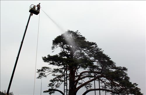 | △ 정이품송에 침투한 솔잎혹파리를 퇴치하기 위한 방제작업 장면. |