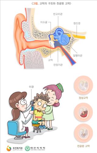 31일 국민건강보험공단에 따르면 '고막천공(H72)' 질환으로 진료받은 인원은 작년 2만2천68명(남성 1만944명, 여성 1만1천124명)이었다. 연령대별 인구를 보정한 인구 10만명당 진료인원은 남성 10대 이하(68명)으로 가장 많았다. 이어 여성 50대·60대(54명), 여성 40대(53명) 등의 순이었다.