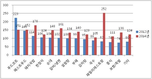 2012년 대비 2014년 매장당 월평균 도시가스 사용량 증가율을 업종별로 살펴보면 패밀리레스토랑이 307%로 가장 높았고 보쌈·족발(83%), 갈비·냉면(57.8%), 돼지국밥(56.1%), 중식(42.3%), 순대(42.3%), 뷔페(41.4%), 설렁탕(34%), 감자탕(29.5%) 등의 순으로 집계됐다.