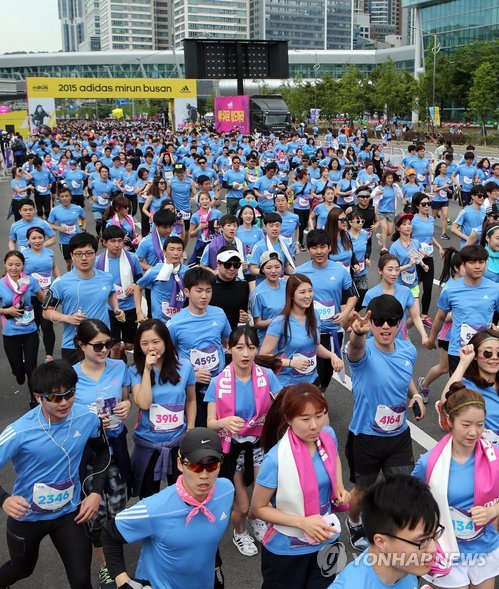 | △ 2만명 참가한 '부산 달리기' (부산=연합뉴스) 조정호 기자 = 17일 부산시 해운대구 벡스코 앞에서 열린 '2015 아디다스 마이런 부산'에서 참가자들이 광안대교를 향해 출발하고 있다. 부산 시립미술관을 출발해 광안대교를 지나 광안리 해수욕장까지 10㎞를 달리는 이 행사에는 2만명이 참가했다. 2015.5.17 ccho@yna.co.kr |