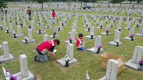 롯데건설 임직원 14가족으로 구성된 봉사단 50여명은 이날 현충탑에서 참배를 마친 후 자매결연 묘역에서 헌화, 태극기 꽂기, 묘비 닦기, 잡초 제거 등 묘역 단장 작업을 벌였다.