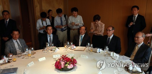 | △ 한일현인회의 환영 만찬 (서울=연합뉴스) 박동주 기자 = 지난달 31일 오후 서울시내 한 한식당에서 열린 한일현인회의 환영 만찬에서 참석자들이 이홍구 전 총리의 인사말을 듣고 있다. |