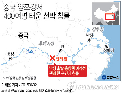 | △ <그래픽> 중국 양쯔강서 400여명 태운 선박 침몰 (서울=연합뉴스) 이재윤 기자 = 중국 양쯔(揚子)강 후베이성(湖北) 젠리(監利)현 부근에서 1일 오후 9시28분께(현지시간) 440여명을 태운 선박 '둥팡즈싱'(東方之星·동쪽의 별)호가 침몰했다고 중국 관영 신화통신 등이 2일 보도했다. |