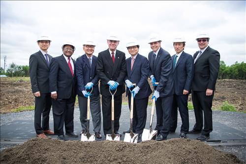 | △ 1일(현지시간) 녹십자 캐나다법인 GCBT의 공장 기공식에서 왼쪽부터 허은철 녹십자 사장, 알란 드수자 생로랭시장, 김영호 GCBT 대표, 자크 다우 퀘백 주정부 경제개발장관, 허일섭 녹십자 회장, 피에르 데로쉬에 몬트리올 시의회 의장, 허진 주몬트리올 총영사, 마리오 모네트 테크노파크 산업단지 사장이 포즈를 취하고 있다. |