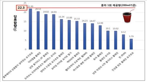 일부 제품은 1회 제공량에 콜라 한컵(200㎖, 당류 22.3g) 수준의 당류가 함유된 것으로 나타났다.