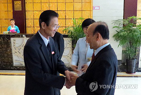 | △ 지난달 5일 6·15 남북공동행사 사전 논의를 위해 남측과 북측 대표가 만나는 모습. 왼쪽은 북측 대표인 김완수 6·15공동선언실천 북측위원회 위원장, 오른쪽은 남측 대표인 이창복 상임대표의장. (연합뉴스 자료사진) |