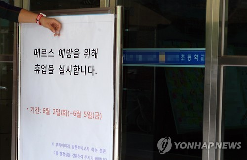 | △ 초등학교 휴업 (수원=연합뉴스) 류수현 기자 = 2일 경기도교육청 등에 따르면 전날 메르스 첫 번째 환자와 접촉한 S(58·여)씨가 숨진 병원 소재지 초등학교 한 곳이 이날부터 오는 5일까지 휴업한다. 메르스 발생 후 전국 첫 휴업사례다. 학교 관계자가 현관문 앞에 휴업 안내문을 설치하고 있다. |