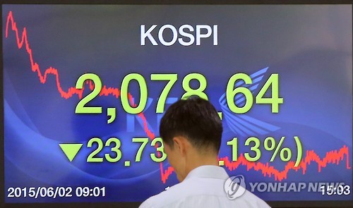 | △ 메르스·환율 악재에 코스피 2,070선 '후퇴' (서울=연합뉴스) 이정훈 기자 = 코스피가 2일 중동호흡기증후군(메르스) 확산과 엔화 약세 심화 등 악재가 겹치며 급락했다. 이날 코스피는 전날보다 23.73포인트(1.13%) 내린 2,078.64로 마감했다. 종가 기준으로 코스피가 2,080선 밑으로 떨어진 것은 지난달 9일 이후 처음이다. 사진은 이날 서울 중구 명동 외환은행 본점 딜링룸. |
